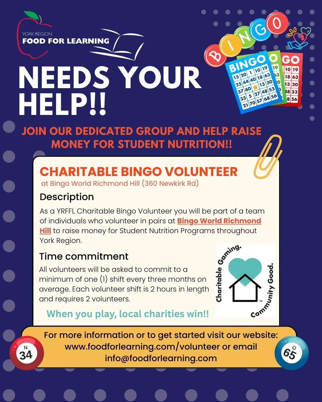 Through our work at Bingo World Richmond Hill we are able to help support Student Nutrition Programs in York Region.